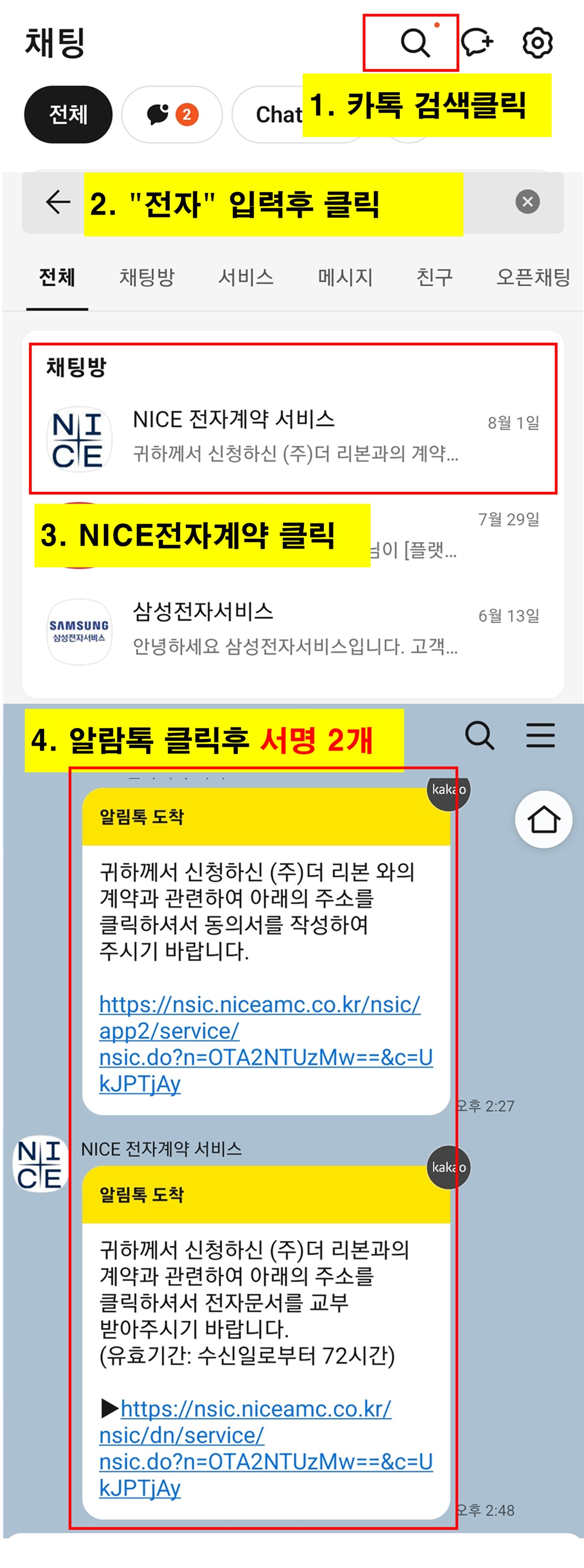 2. 청약서 작성 후 전자서명 : 카톡 알림톡 URL 2개 전송(만약 1개만 온 경우 담당자에게 회신)